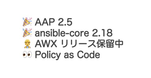 この記事は Ansible Advent Calendar 2024 の 24日目の記事です。 はじめに リリースや発表 AAP 2.5 リリース Policy as Code AAP 1.2 の Extended life cycle support (ELS) add-on 終了 ansible-core 2.17 / Ansible 10 リリース ansible-core 2.18 / Ansi…